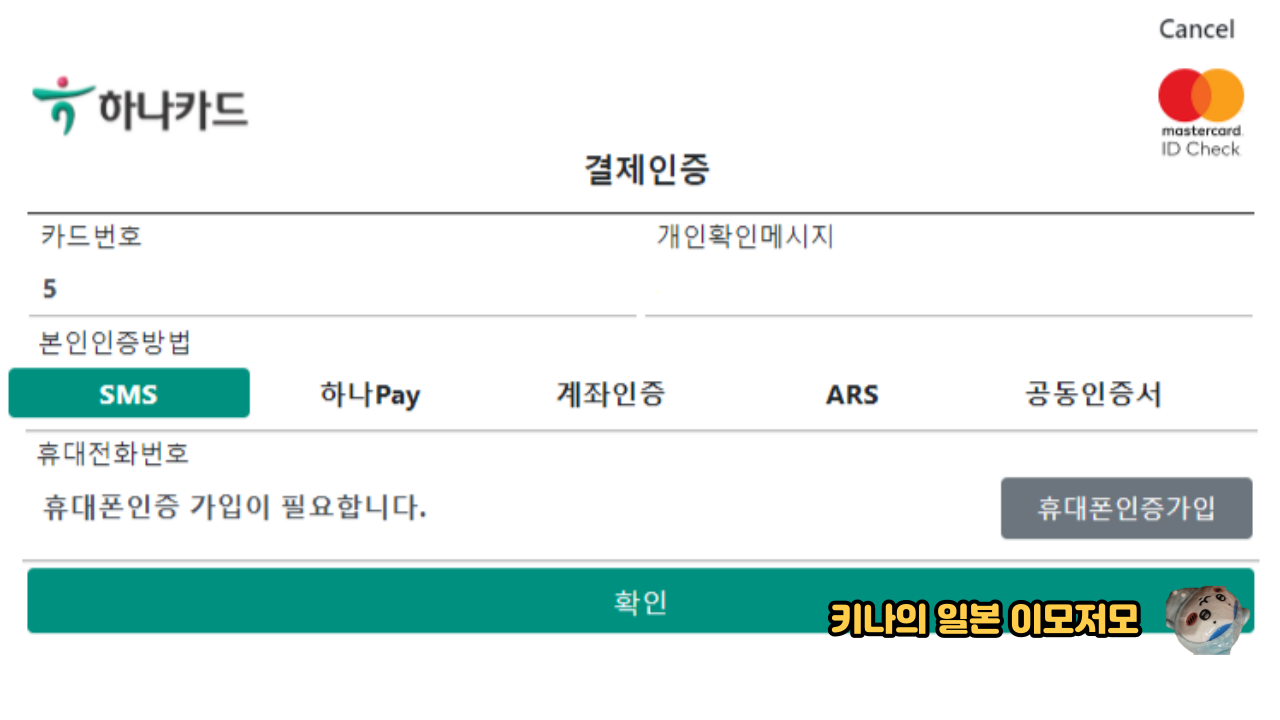 저는 하나카드를 사용중이기 때문에 하나카드의 창이 나왔습니다.