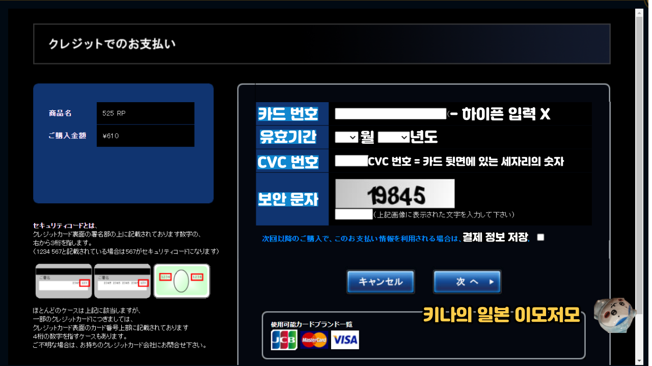 5. 카드 번호, 유효기간, CVC 번호, 보안 문자를 입력합니다.